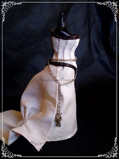 El vestido está hecho con telas de algodón de color marfil y cintas de raso marrones. Como adornos, una rueda de reloj y una cadena de la que cuelgan dos llaves.